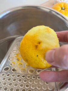 ③ゆずの実は種や皮を除き、果汁を絞っておきます。